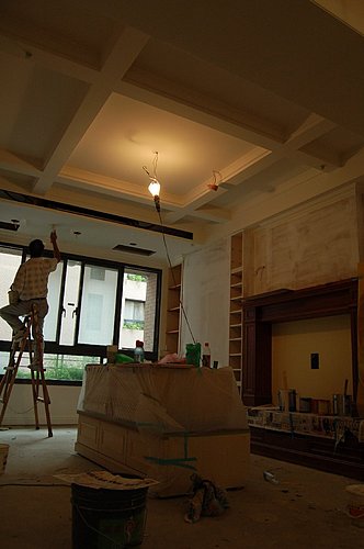 結果燈具公司人手不足, 竟然是由木工張先生自己幫我們安裝坎燈. 自己賺安裝費囉! 主燈就等地板安裝好後在安裝了!
