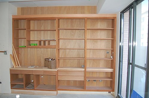 書房的書櫃結合了三種不的木材, 包括桃花心木貼皮, 松木檯面與實木線板. 本來淺色的線板造型被我嫌個性不足, 所以後來改成了深色花梨木.