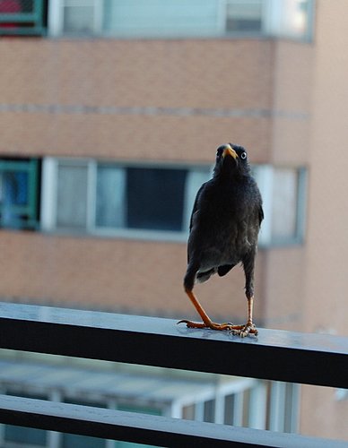 沒錯就是下面這位主角--什麼鳥如此大膽? 廚具安裝的師父馬上說是隻九官鳥, 在戶外徘徊已久.